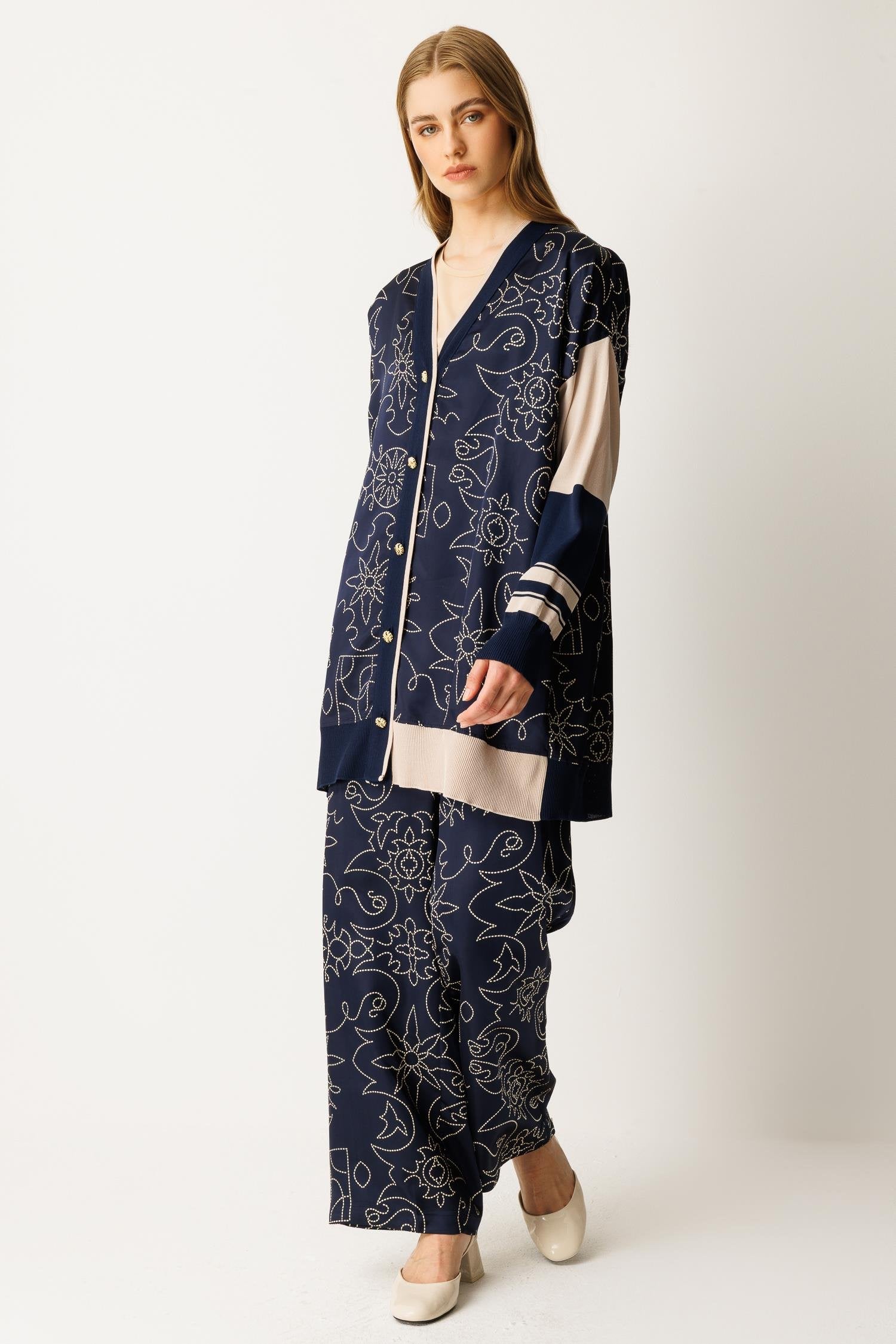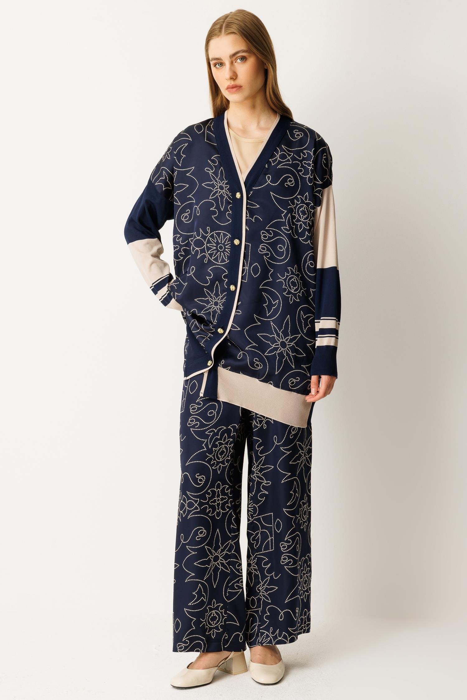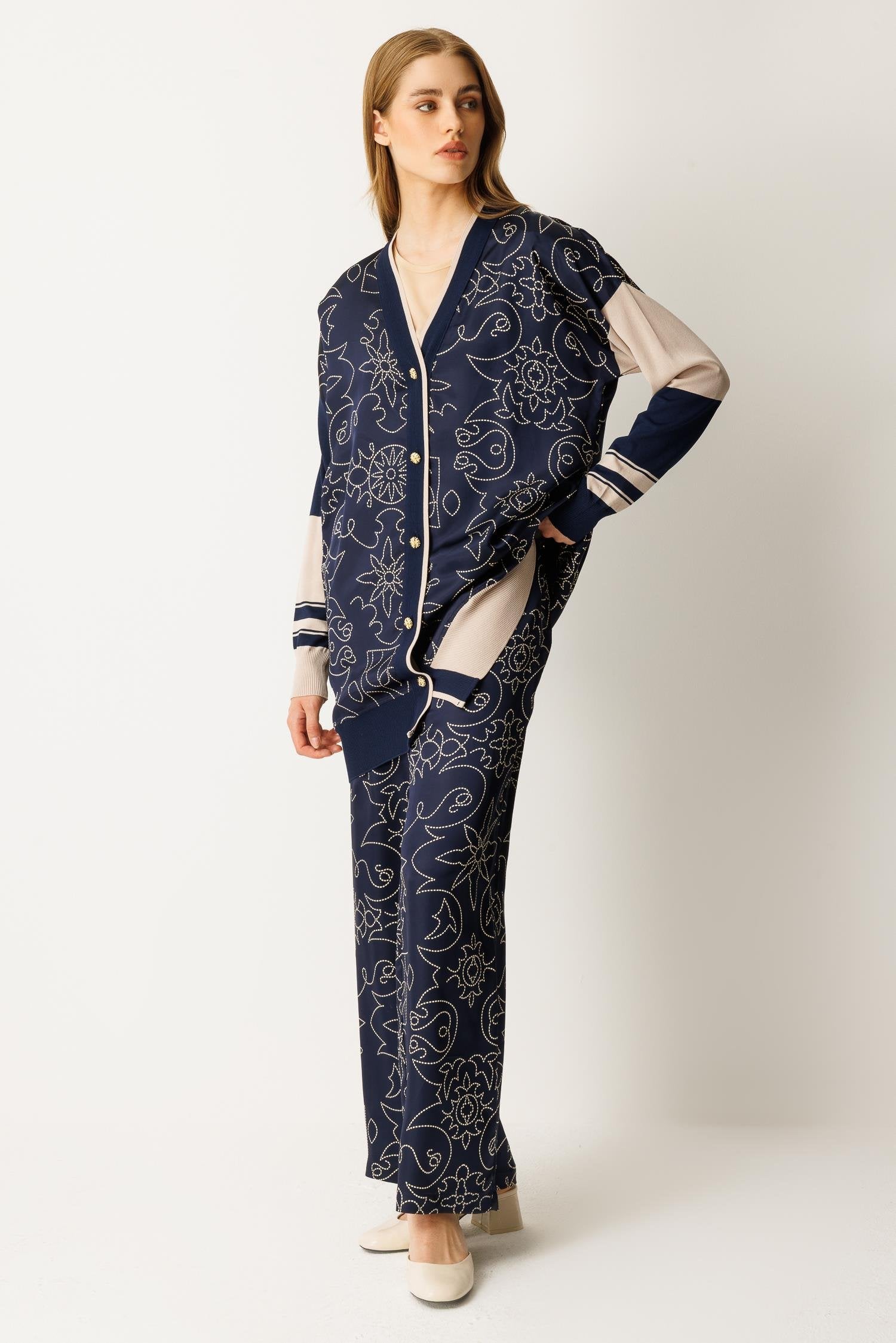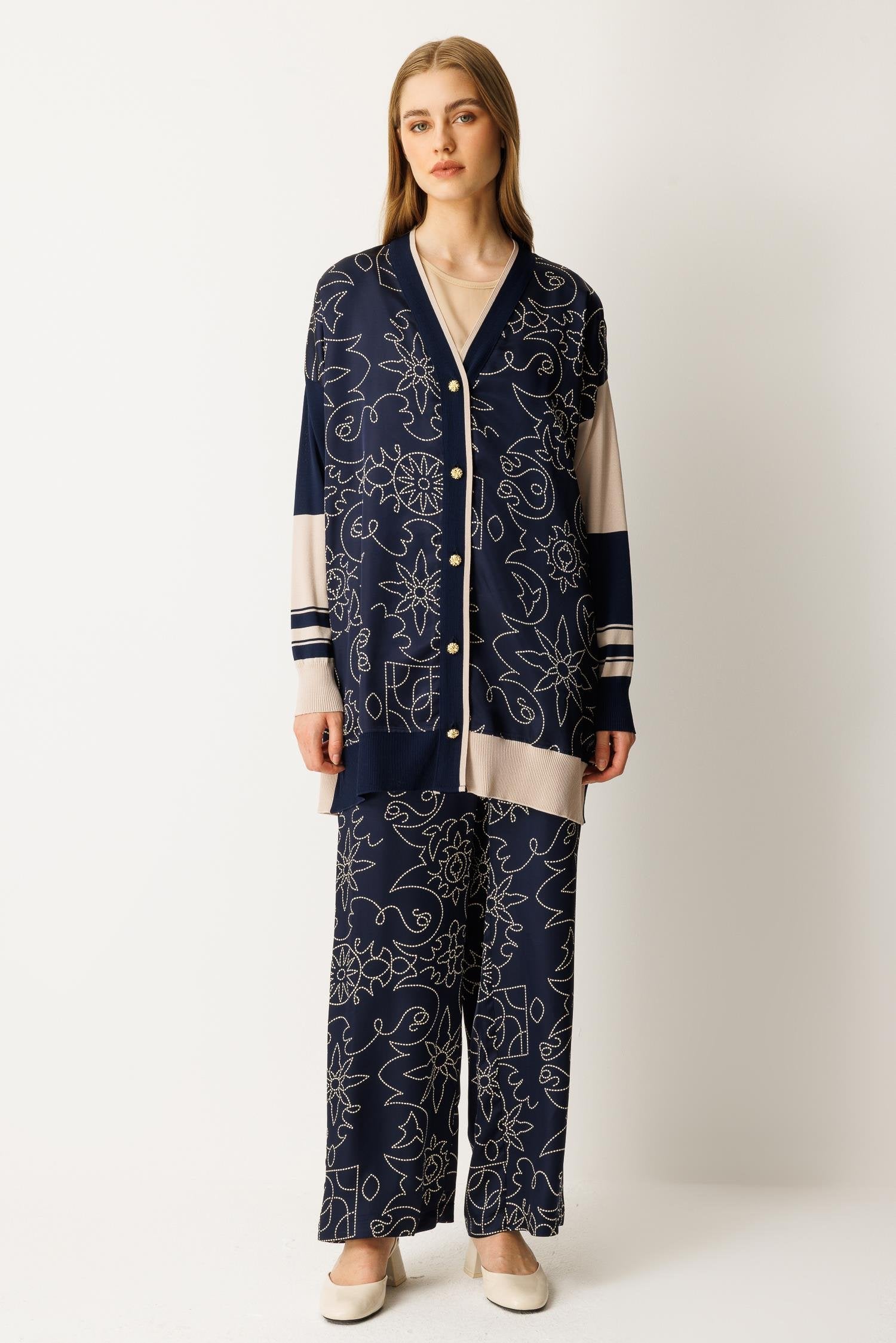Düğme kapamalı, saten ve triko kumaş karışımı alt-üst takım. Şık ve modern tasarımıyla hem günlük kullanım hem de özel anlar için ideal bir seçenektir.