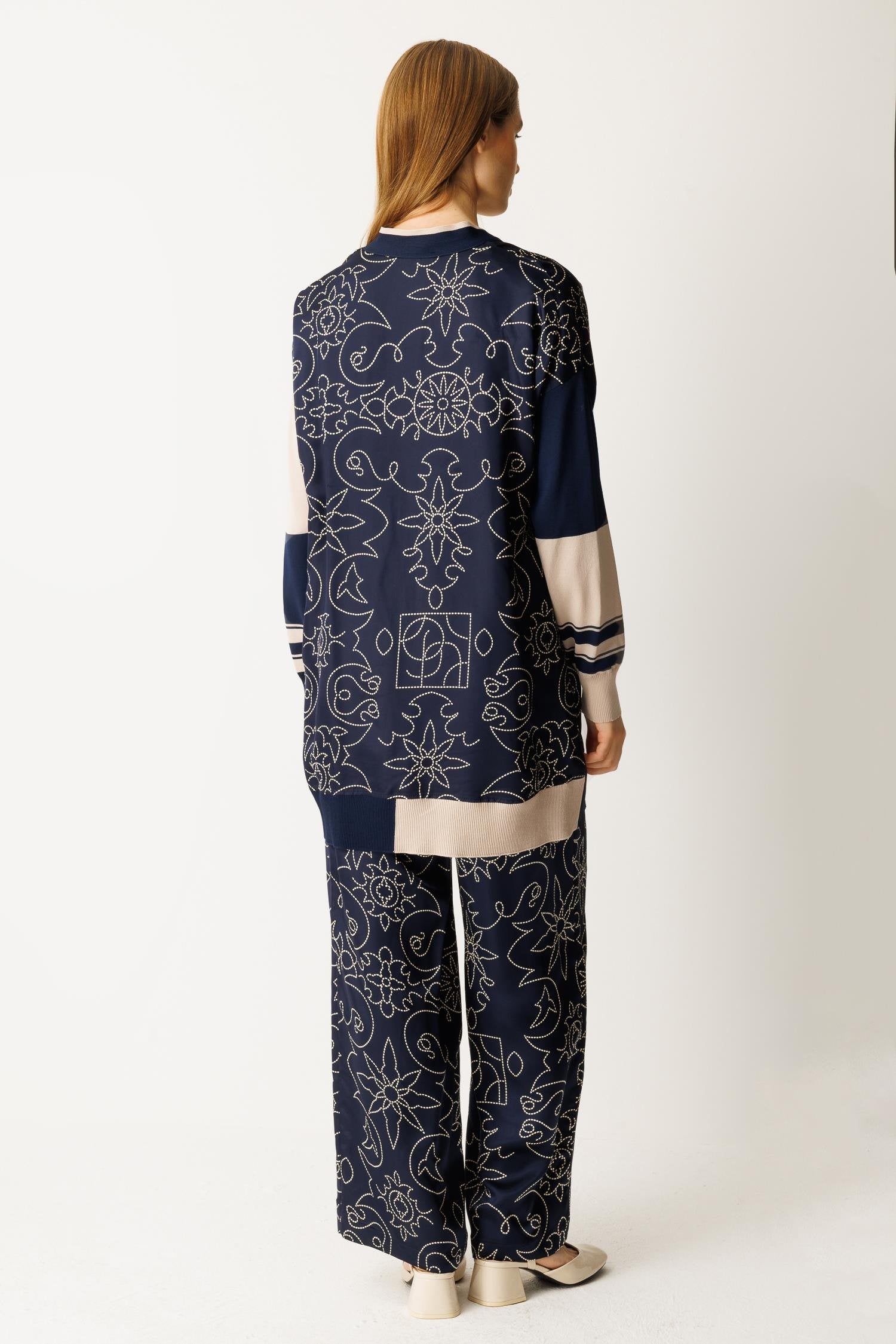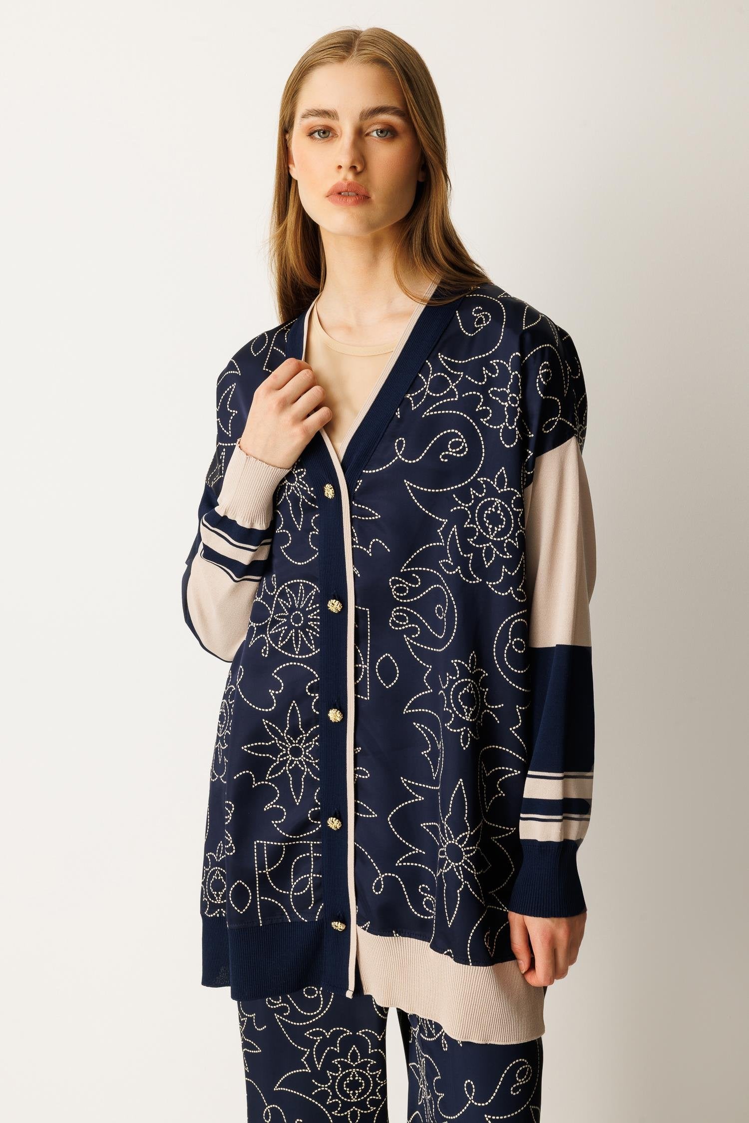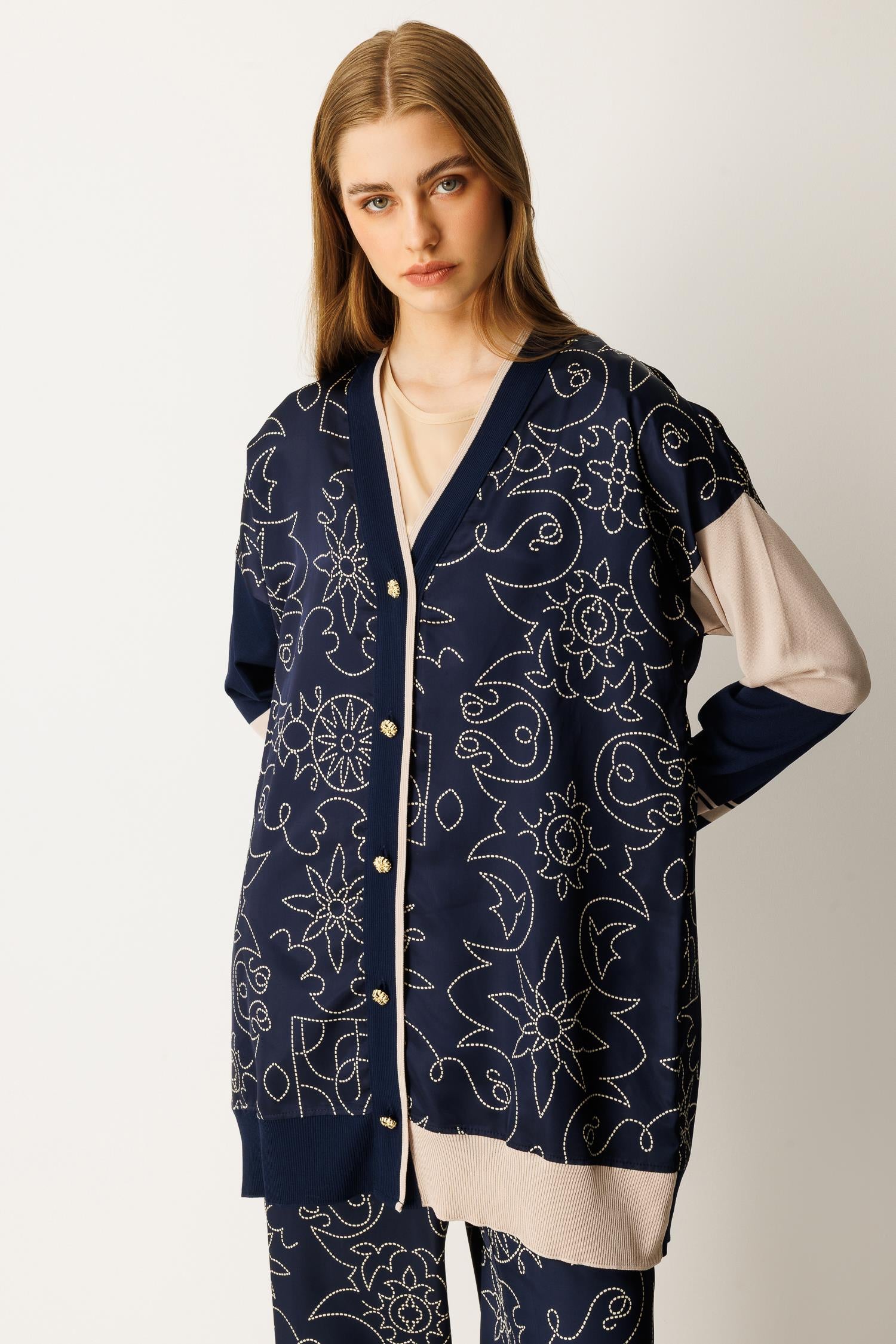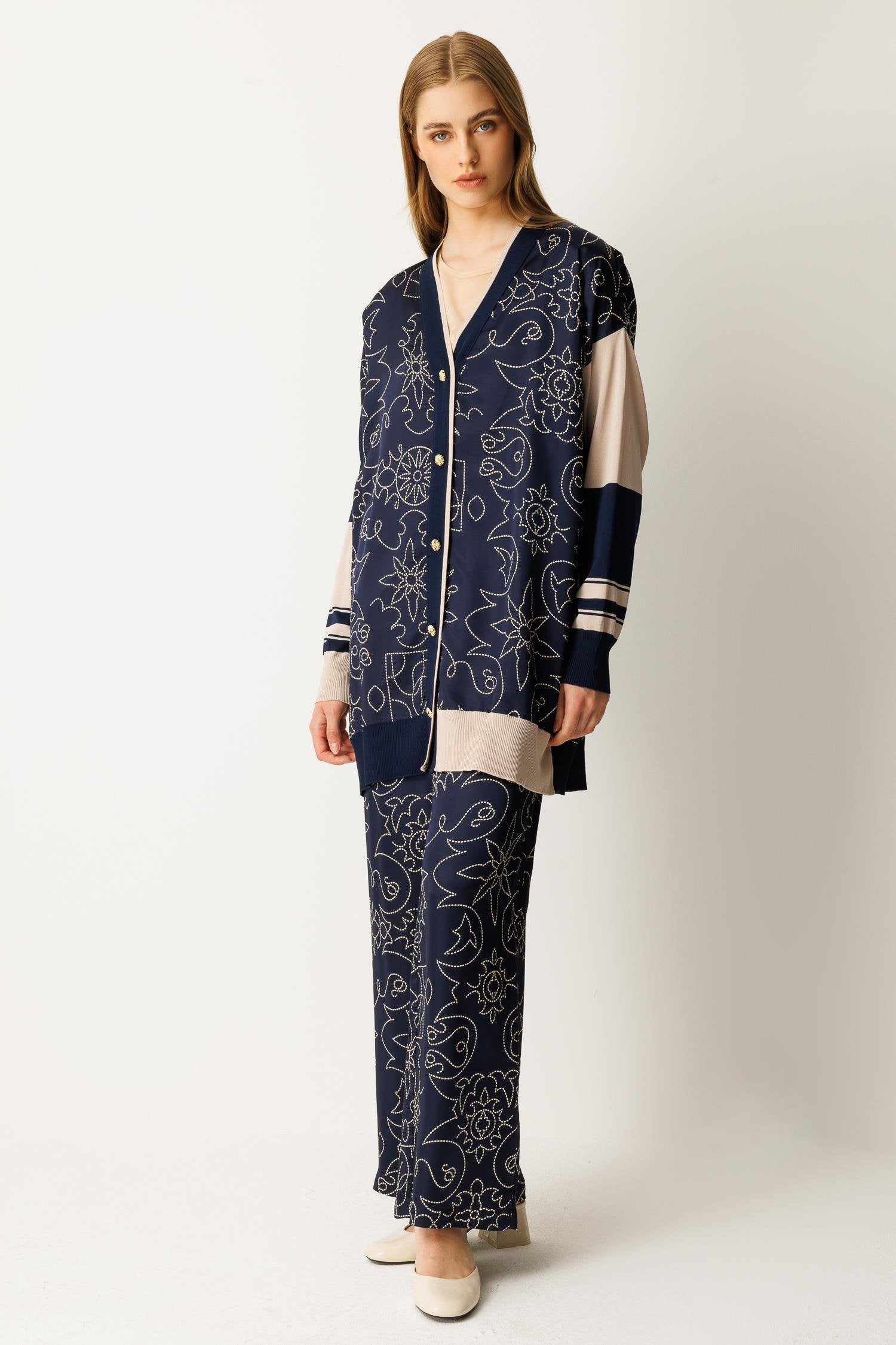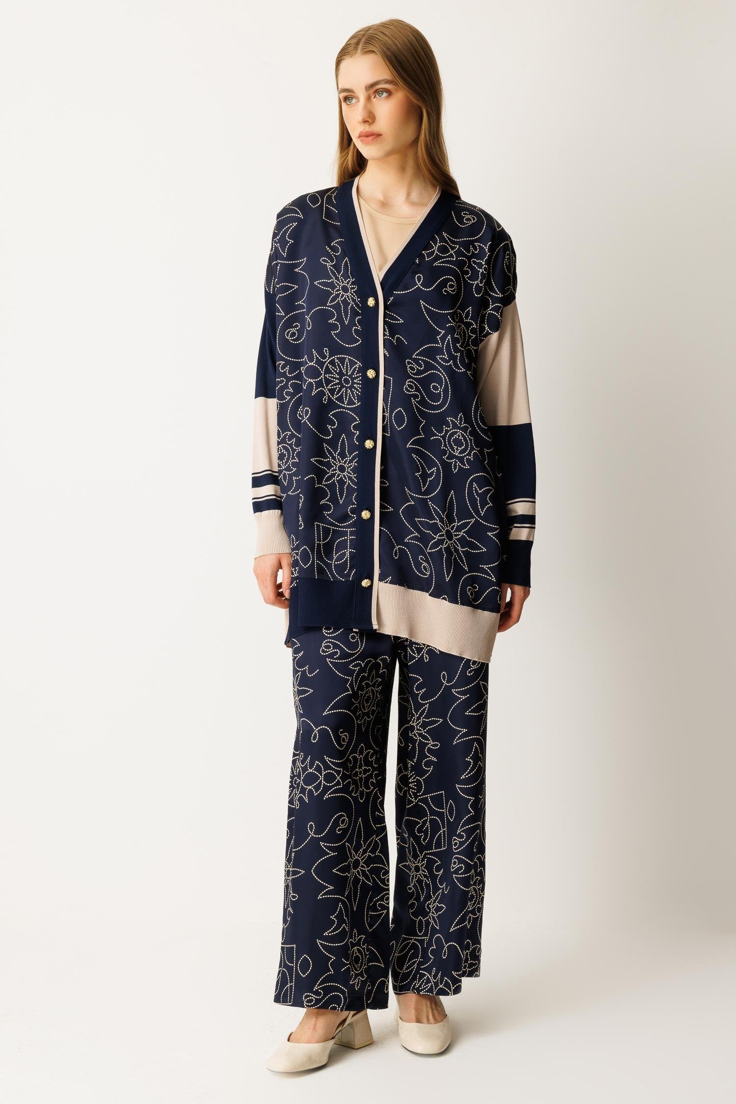 Düğme kapamalı, saten ve triko kumaş karışımı alt-üst takım. Şık ve modern tasarımıyla hem günlük kullanım hem de özel anlar için ideal bir seçenektir.
